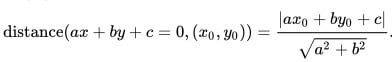 - a, b, and c are the coefficients (and constant) for the line a x + b y + c = 0.