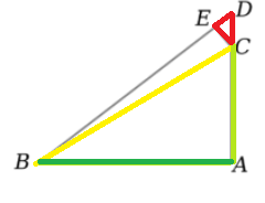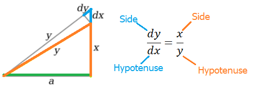 If we increase the side AC to point D (first triangle) by a minimal amount dx (second triangle), then we would extend the side to the point D. This means that the hypotenuse y will also be extended by a minuscule amount. These increments create a new triangle CDE (shown in red).